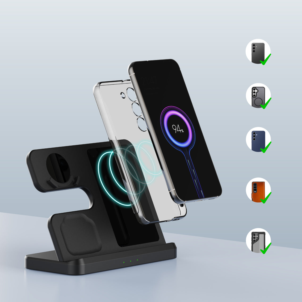 Upplev bekvämligheten med att ladda tre enheter samtidigt med premiumkvalitet och modern design.